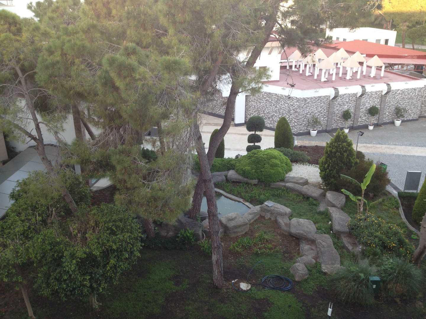 Gartenblick mit Sicht auf das Hotel Voyage