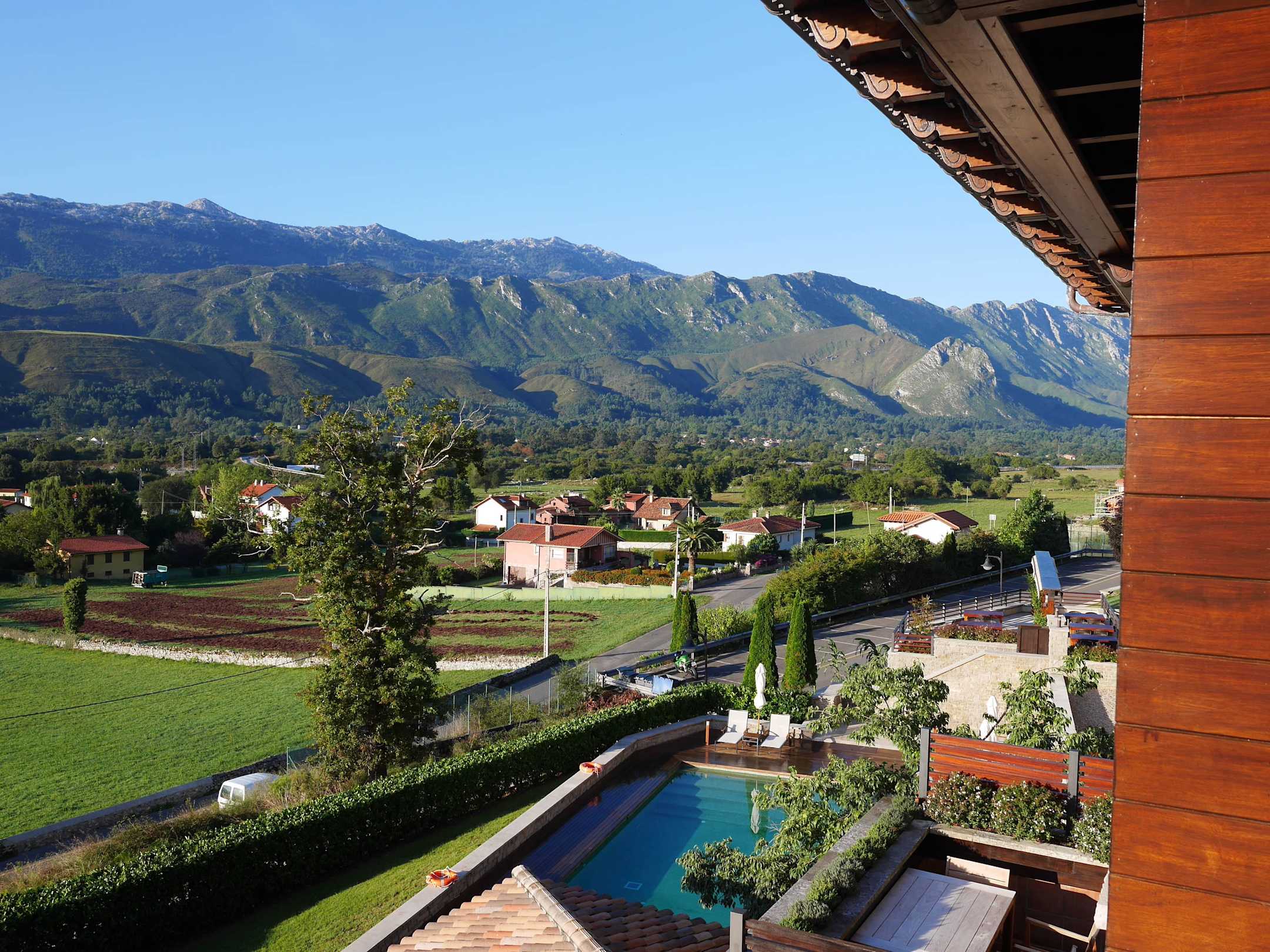 Blick vom Zimmer auf Restaurantterrasse und Pool