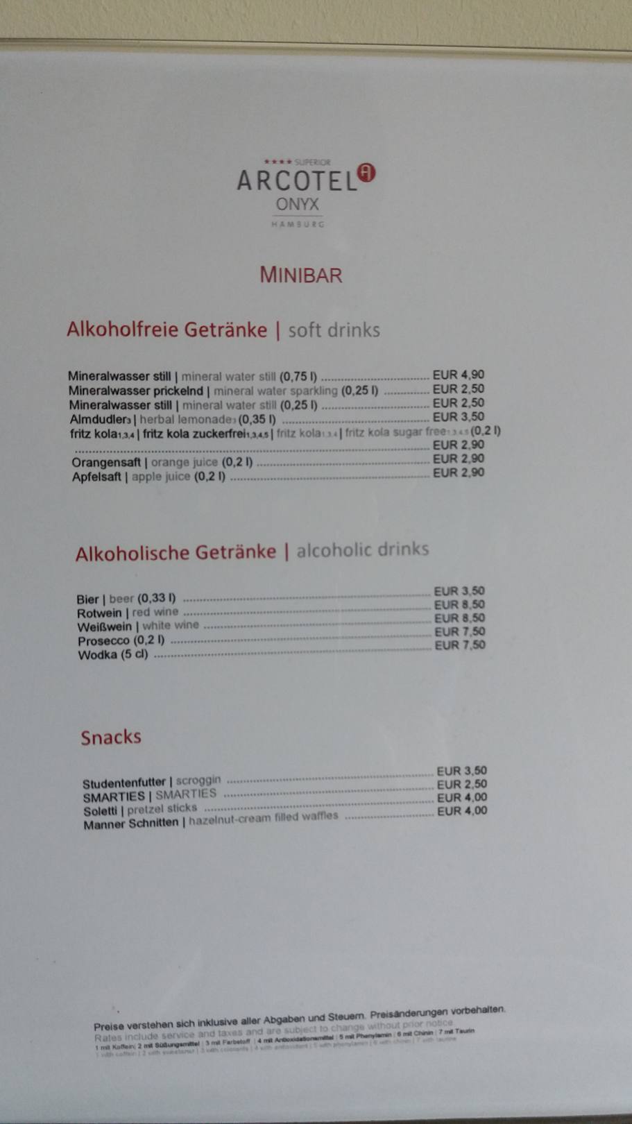 Die Karte für den Zimmerservice ARCOTEL Onyx Hamburg