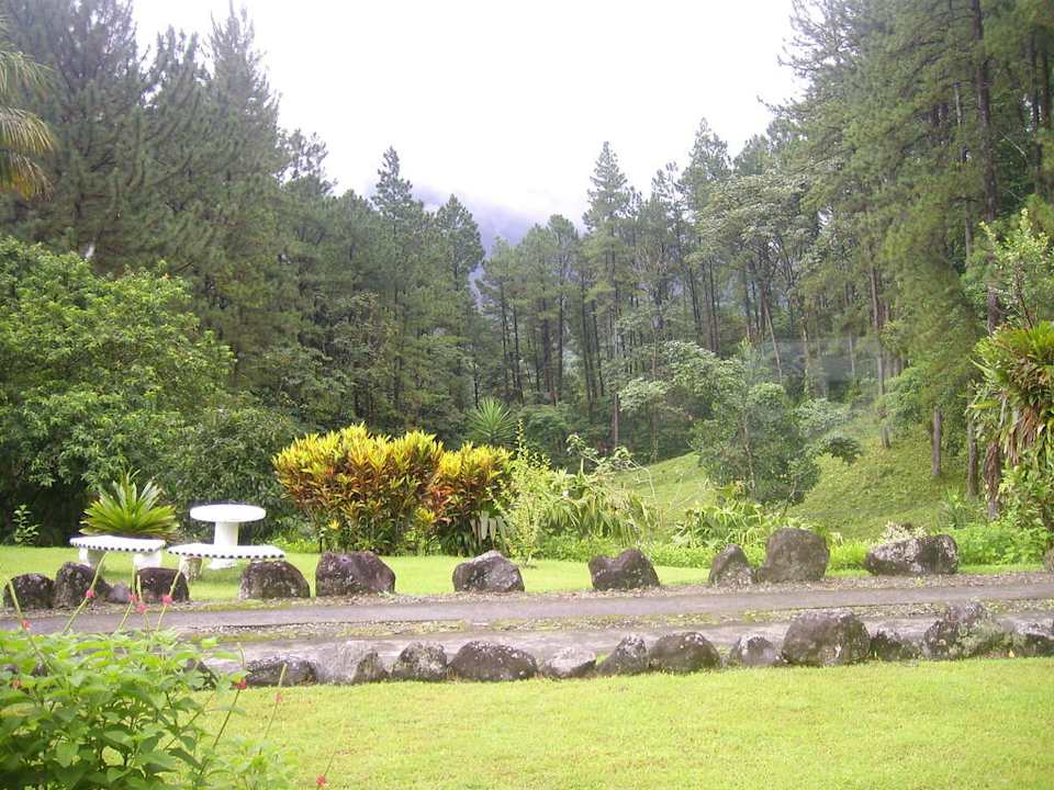 Gartenanlage mit Vulkan Arenal im Hintergrund