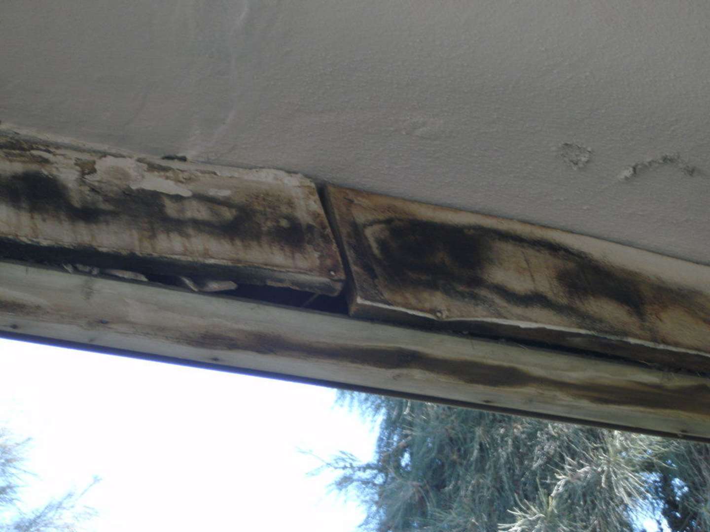 Die Balkondecke. Schimmelig und marode.