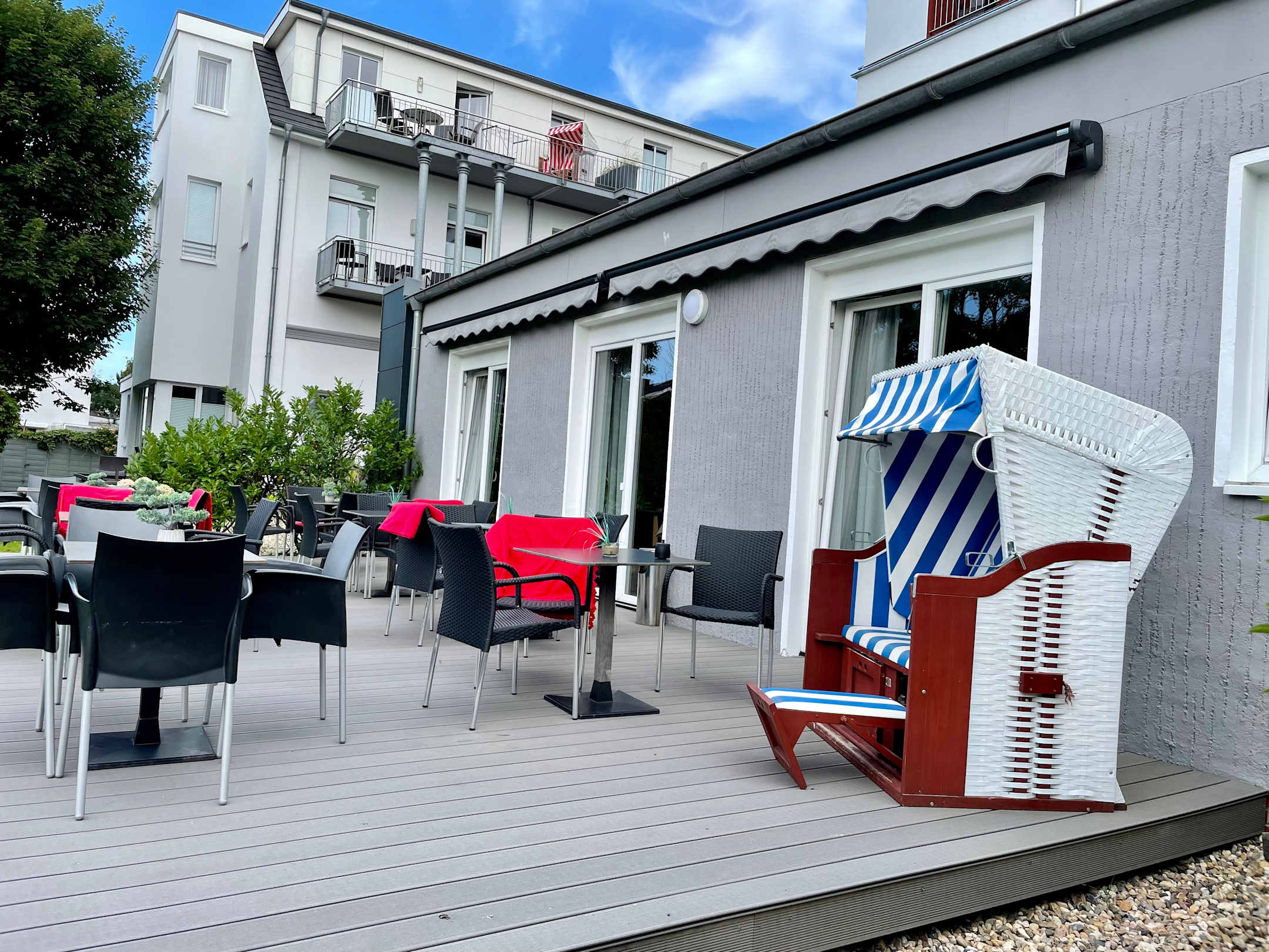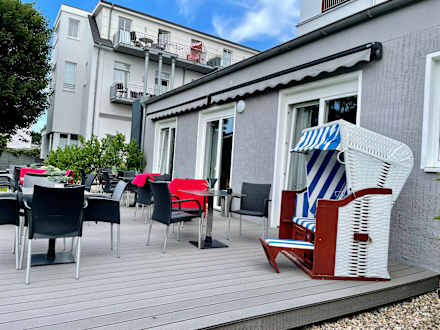 Die Terrasse. Hier kann man frühstücken.