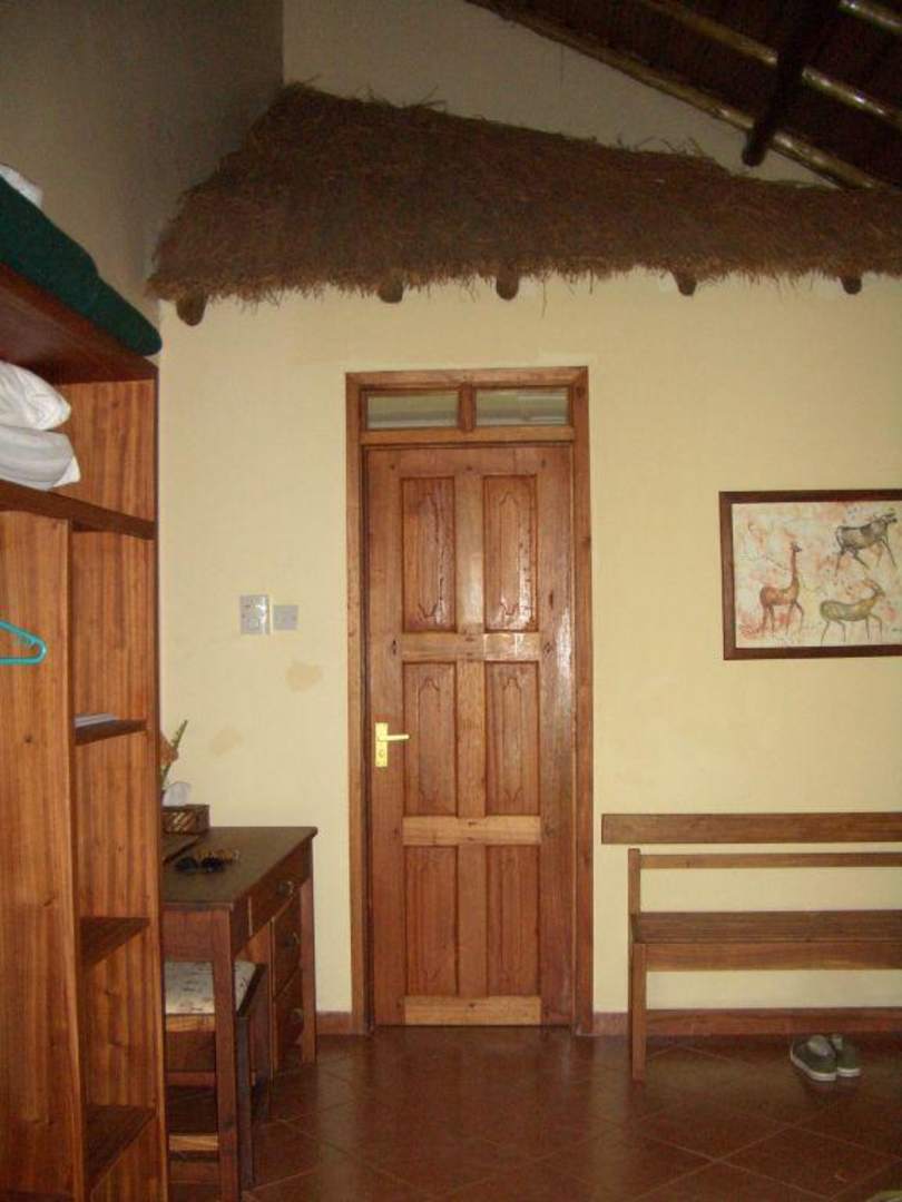 Zimmer, Blick auf Badezimmertür mit Strohdach