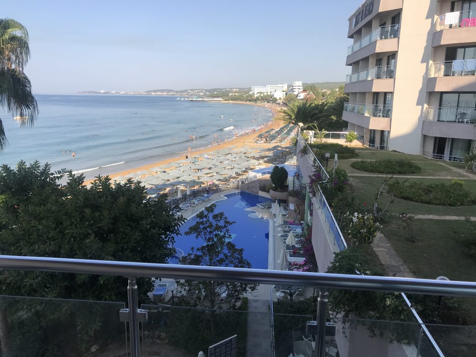Blick vom Balkon auf den Pool undStrand