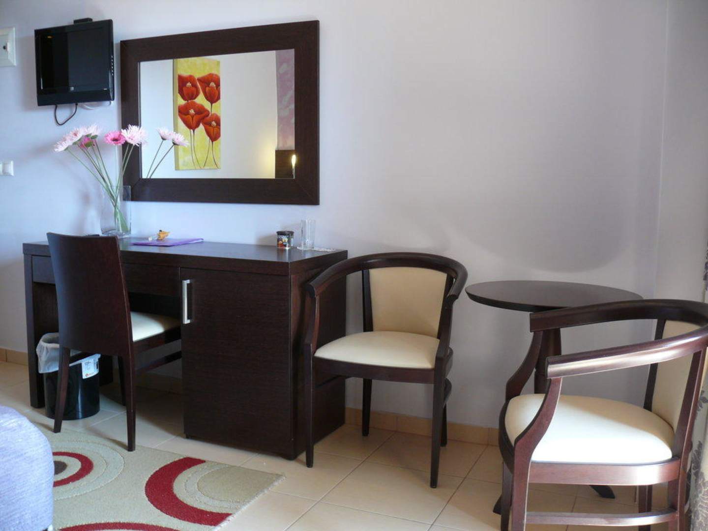Schreibtisch mit Flachbildschirm an der Wand, Tisch mit zwei Stühlen als Sitzecke
