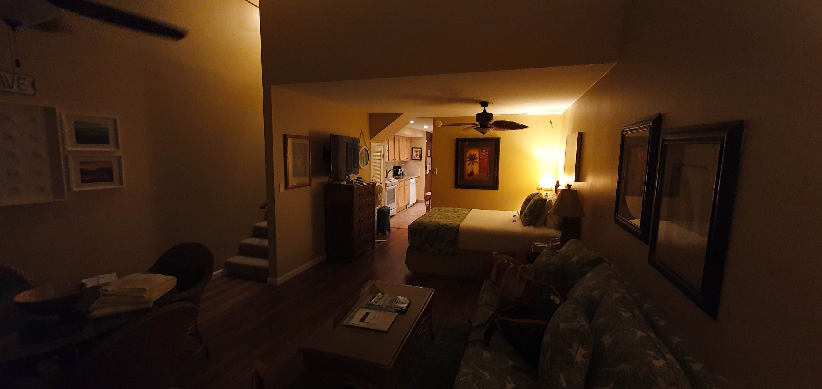 Wohnzimmer mit Blick aufs Bett und die Treppe in den oberen Bereich
