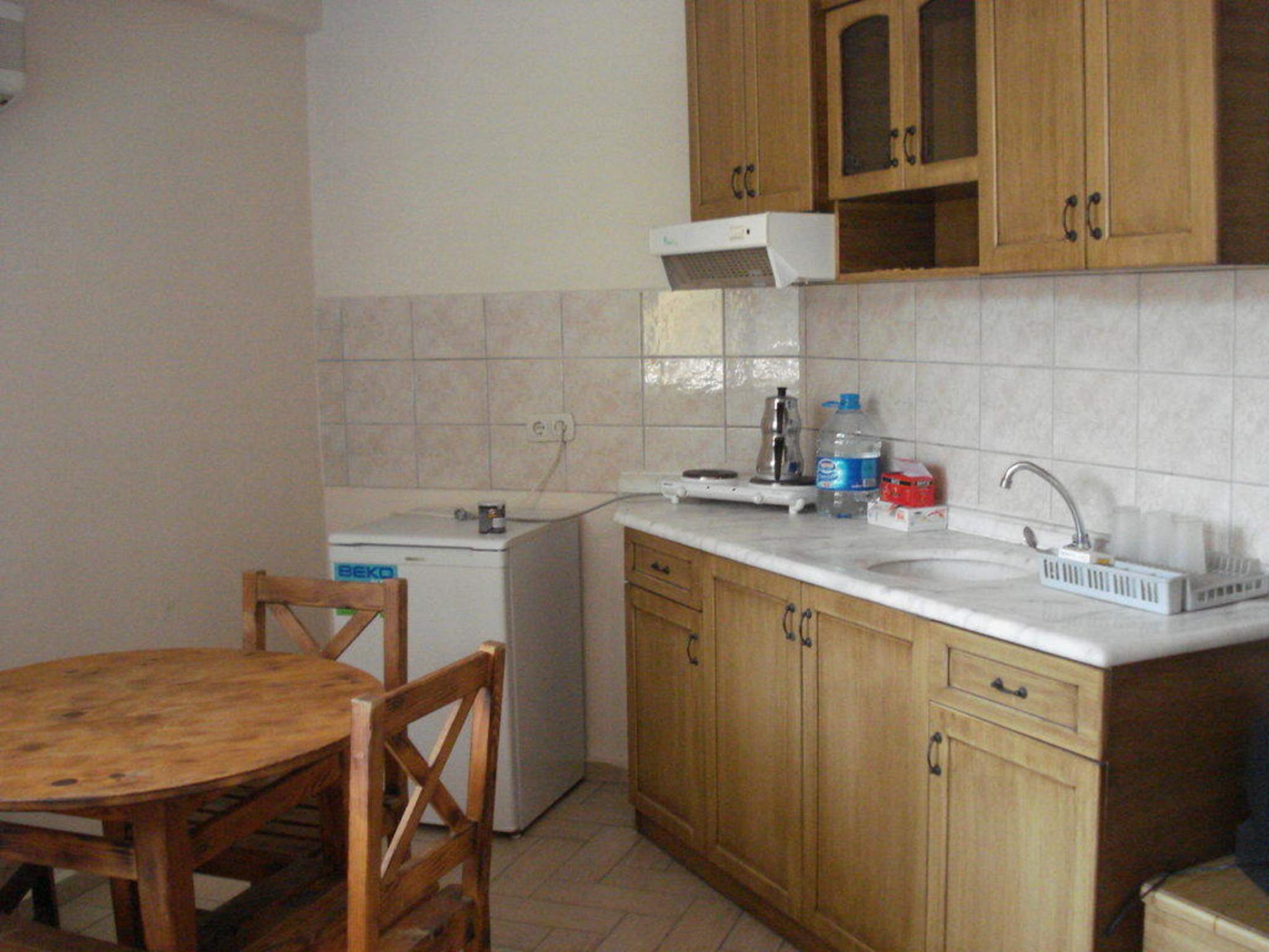 Küchenzeile mit Herdplatten, Kühlschrank, Esstisch