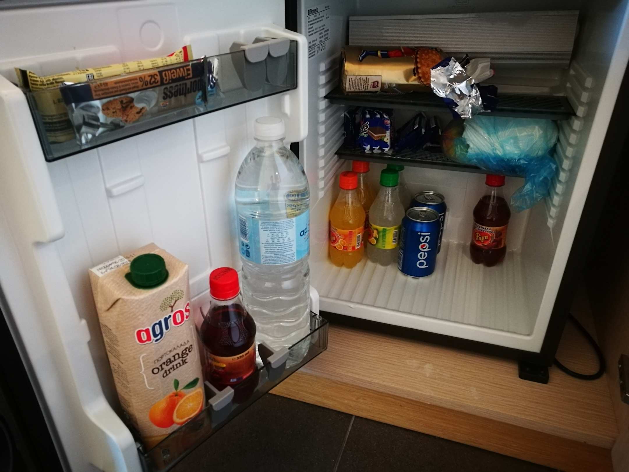 ZimmerMinibar Erstbefüllung mit diversen Getränken. Die Snacks hatten wir mitgebracht. Kühlschrank läuft auf Dauerstrom.