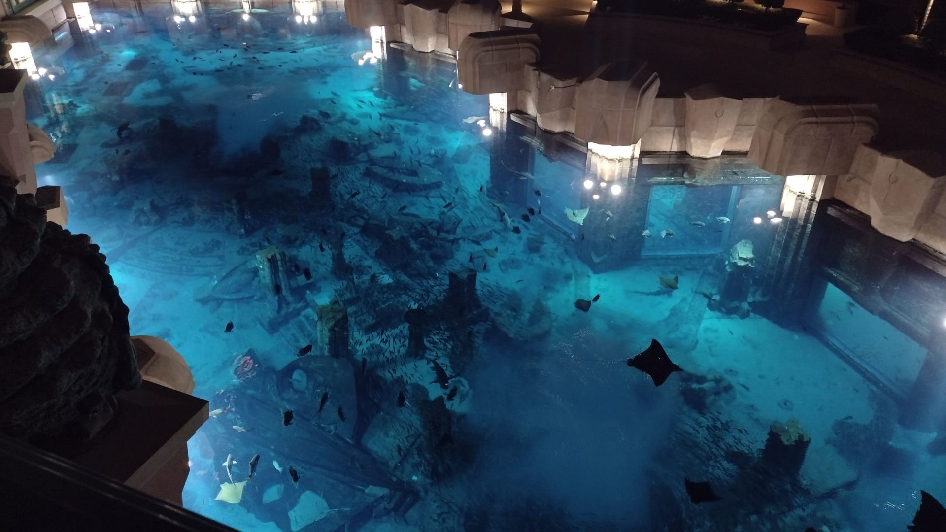 Abendlicher Blick vom Balkon auf das Großaquarium