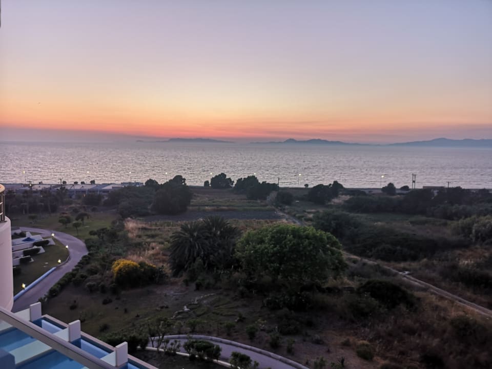 Balkonausblick aufs Meer mit Sonnenuntergang