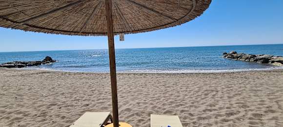 Jede Liege hat seinen eigenen Schirm. Der Hotelstrand ist mit Sand. Im Wasser beginnt Kiesel