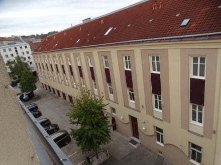 Ausblick vom Fenster auf den Parkplatz im Innenhof