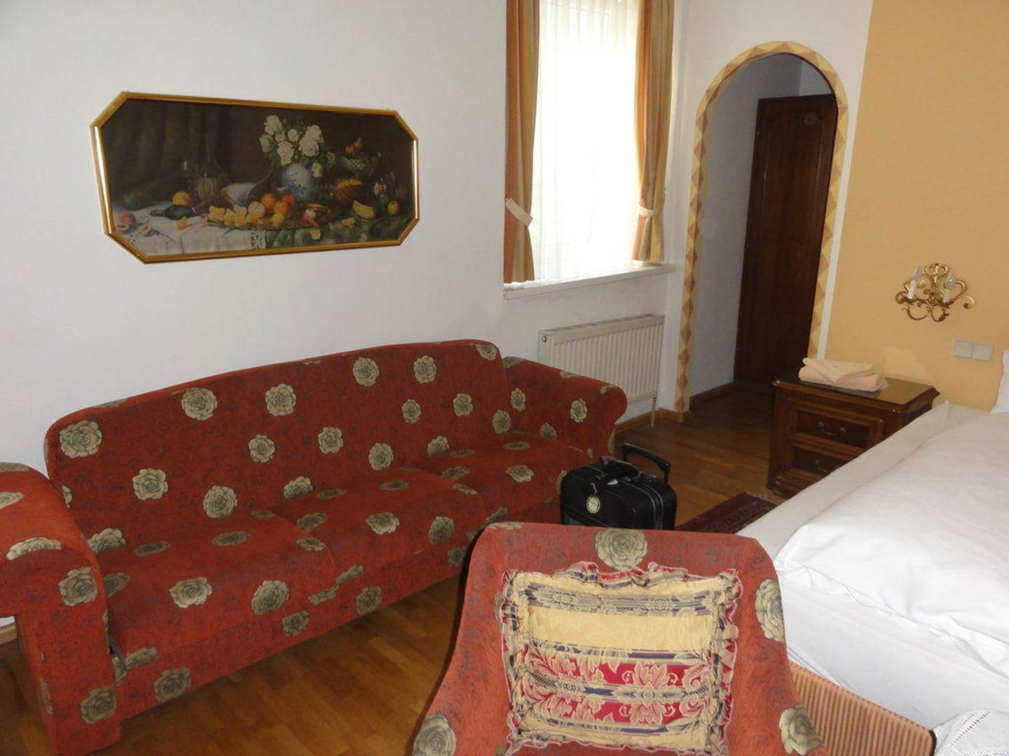 ZimmerGeräumiges Zimmer. Alles passend im "alten" Stil. Alles sauber. Rechts bei dem Durchgang ging es zim Bad.
