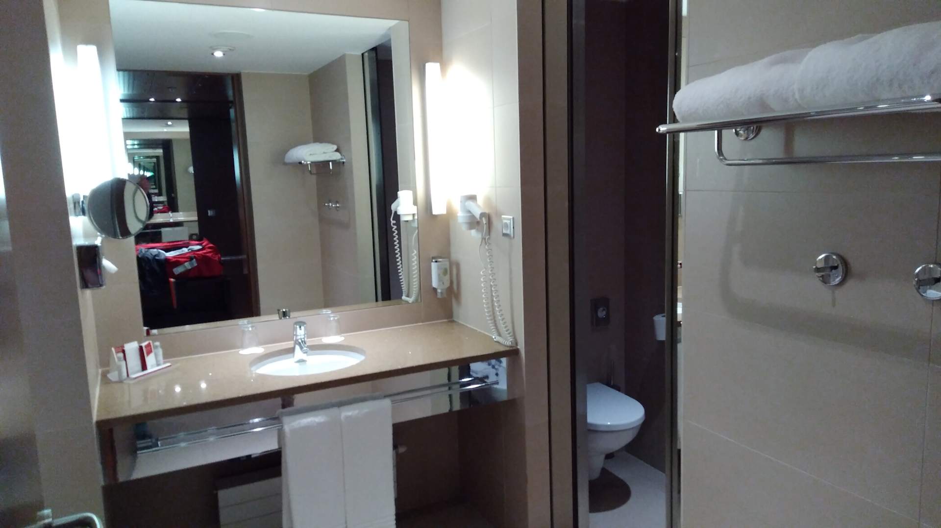 Blick ins Bad, die Toilette und das Bidet rechts sind durch eine verspiegelte Schiebetür abgetrennt.