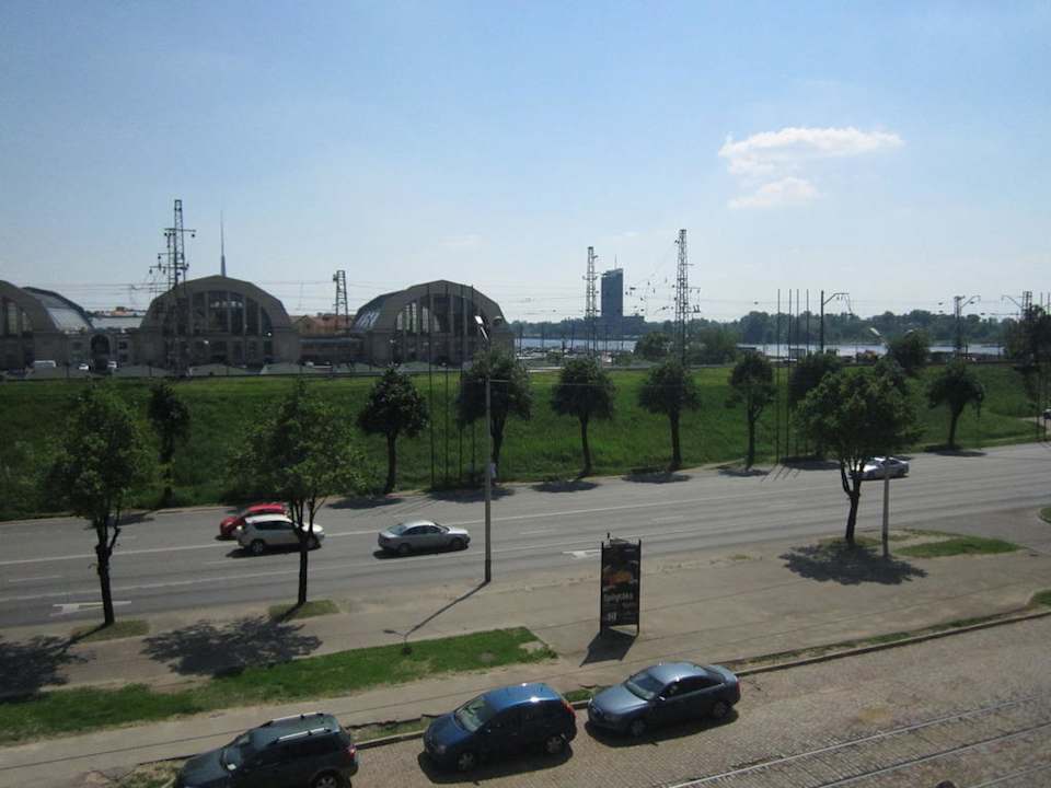Ausblick vom ZimmerDie Kamera habe ich seitlich aus dem Fenster gehalten. Denn ganz öffnen lassen sich die Fenster im Hotel leider nicht. Blick auf die Markhallen und den Fluss. Der Fernsehturm von Riga ragt hinter der zweiten Markthalle (mittig) heraus.