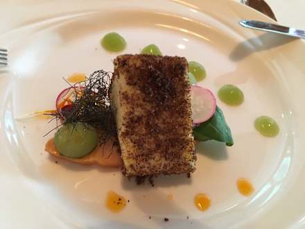GastroGräuchertes Butterfischfilet mit eingelegten Gin-Gurken, mit Erdäpfelterrine in Pumpernickel-Brösel und Wildkräutersalat - war köstlich