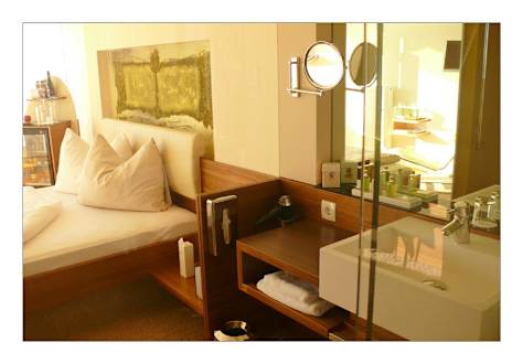 Die Glaswand, die Bad und Schlafzimmer trennt