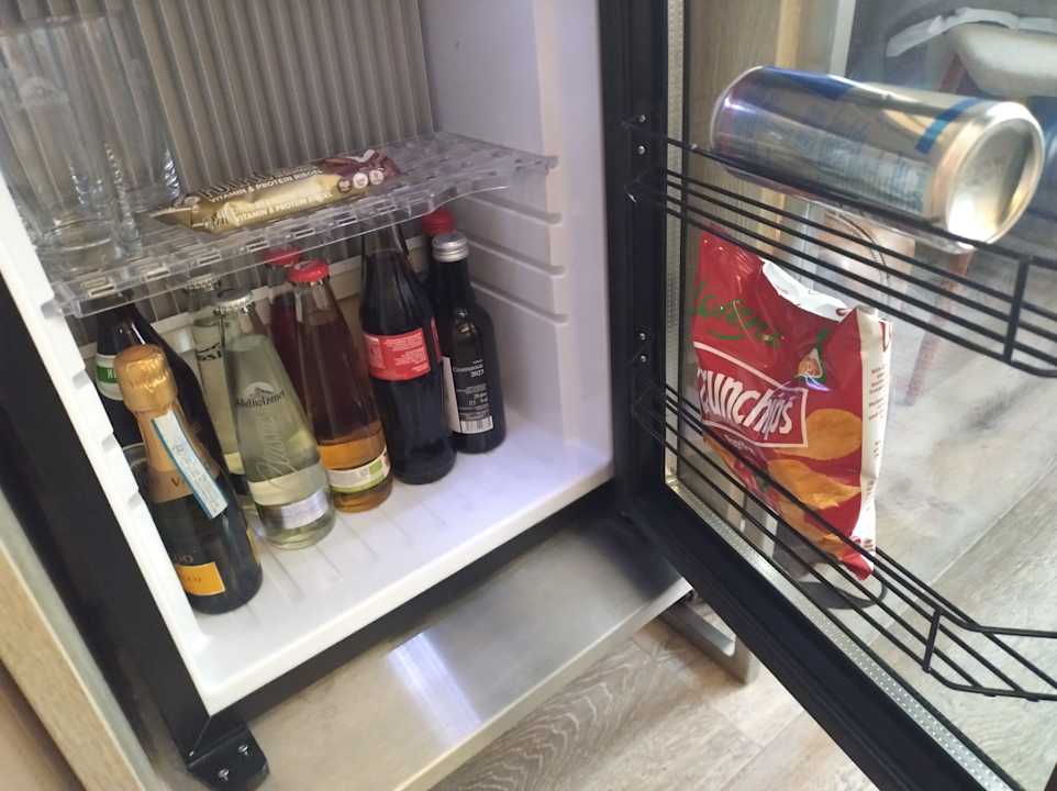 ZimmerBestückte Minibar, sieht man selten! Preisliste lag nicht aus. Die Chips durfte ich trotz vieler Mängel mit 4€ beim Check Out bezahlen.