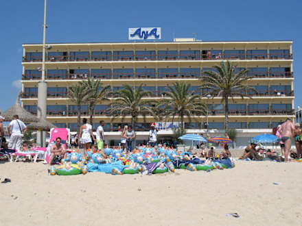 Eine lustige Gruppe mit Kuh-Luftmatratzen