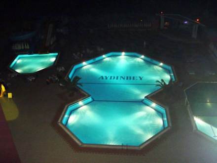 Die Poolanlage am Abend aus dem 5. Stock fotografiert. Links zu sehen die Rutschen, rechts der Kinderpool. Im Hintergrund ist die Animationsbühne zu sehen.