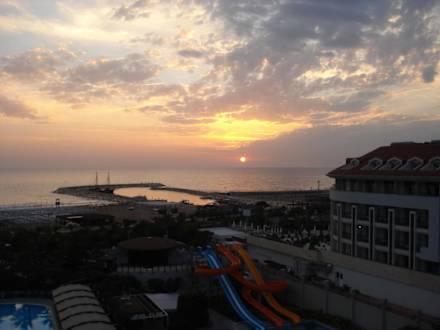 vom Balkon sehr schöner Ausblick mit Sonnenuntergang