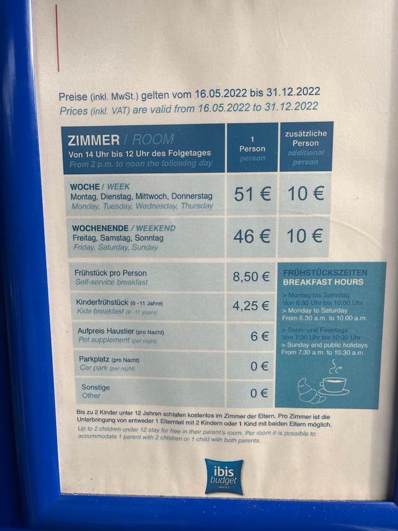 Preisliste im Sept. 2022