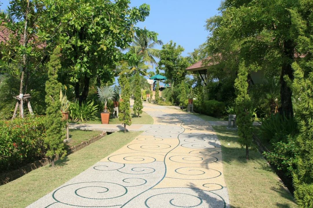 dieser schöne Weg führt einmal längs durch die Anlage von der Rezeption zum Strand -