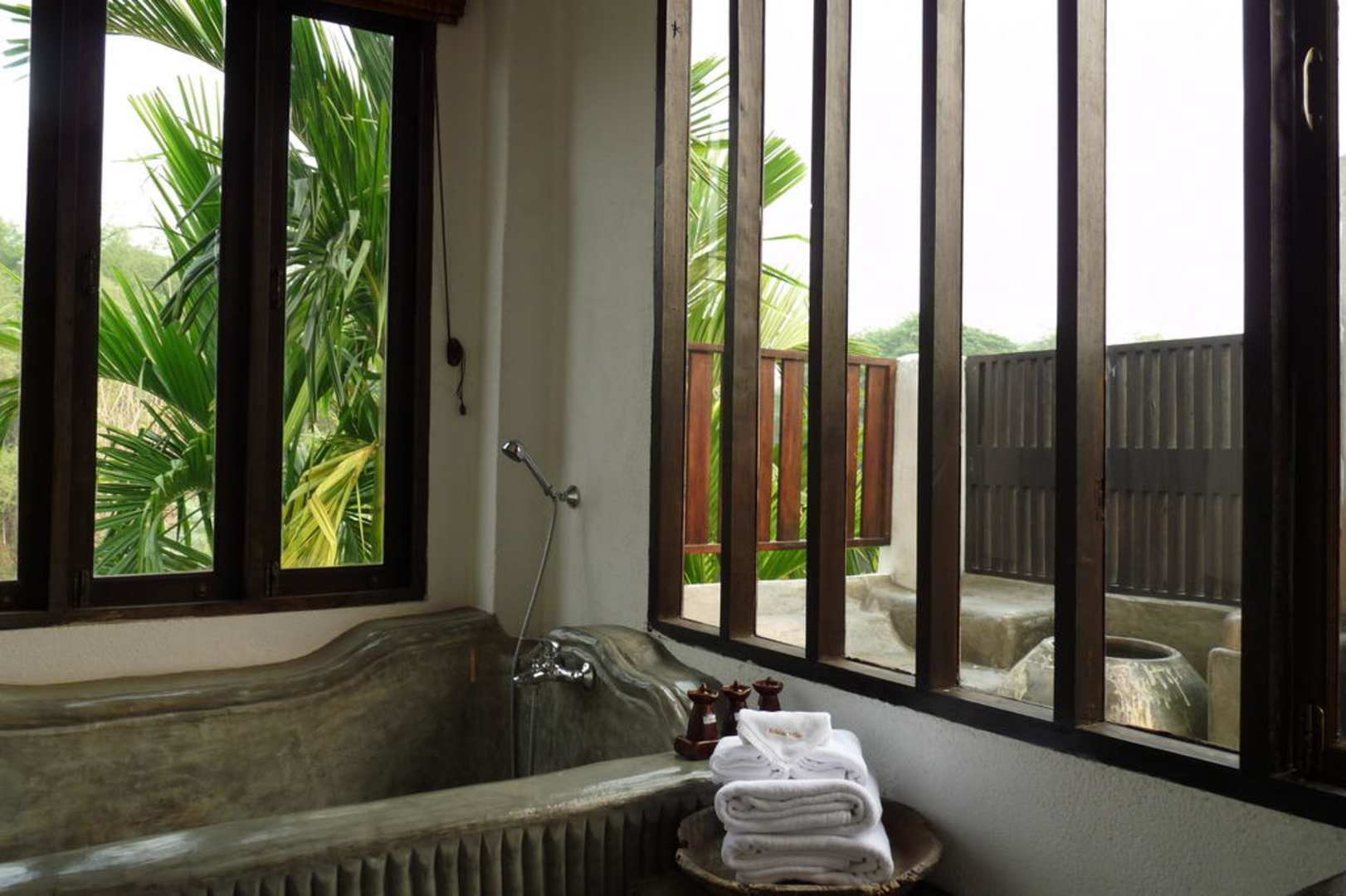 Steinbadewanne im Bad und Außendusche