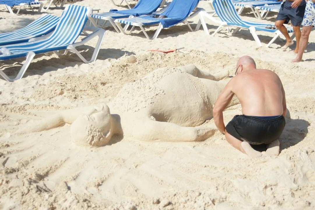 In drei Tagen hat er verschiedene Figuren in den Sand gezaubert. Dann eine kleine Spendentasche aufgestellt und für Haiti gesammelt. Das Beben war zwei Tage zuvor. Super Idee