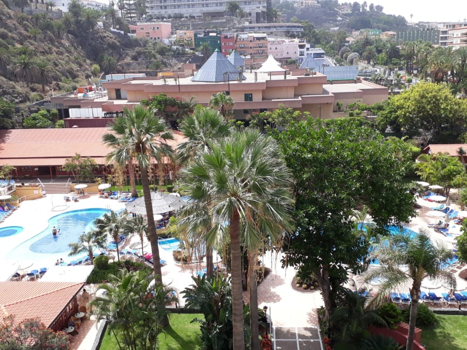 Blick vom Balkon auf die Pool- und Gartenanlage