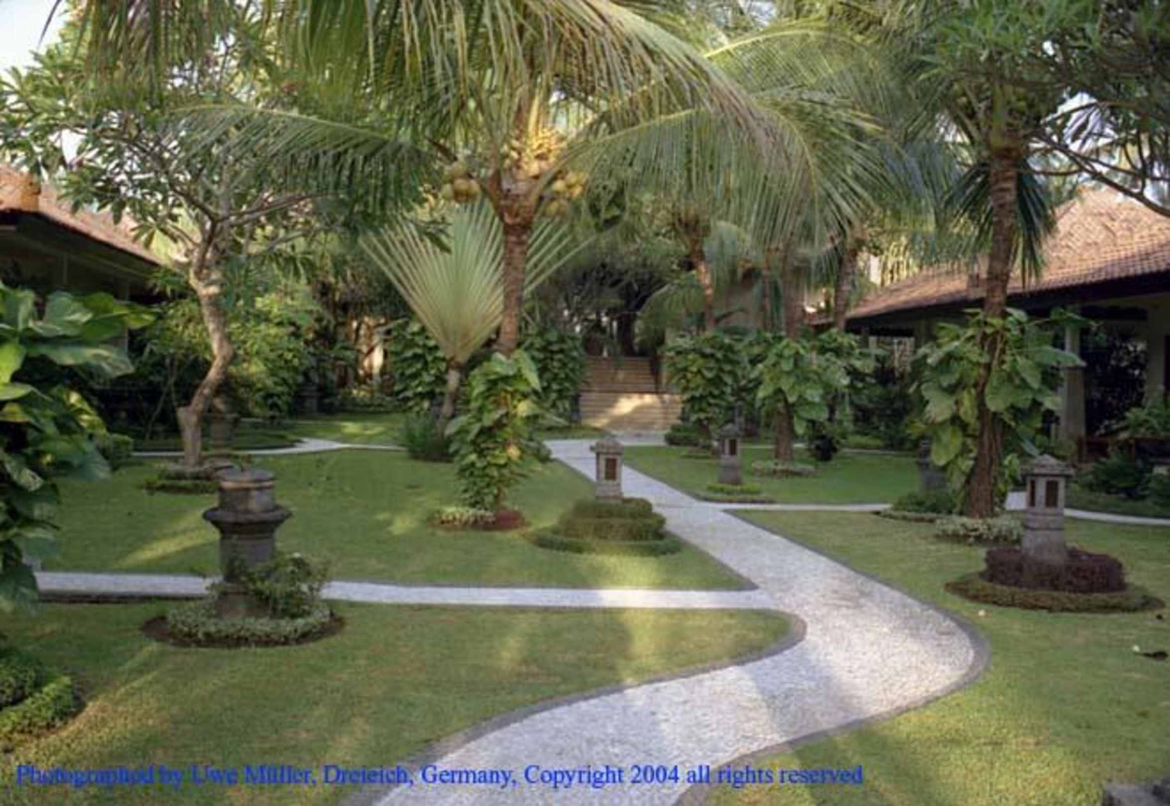 Gartenanlage des Bali Reef Resort vom Restaurant in Richtung Lobby.