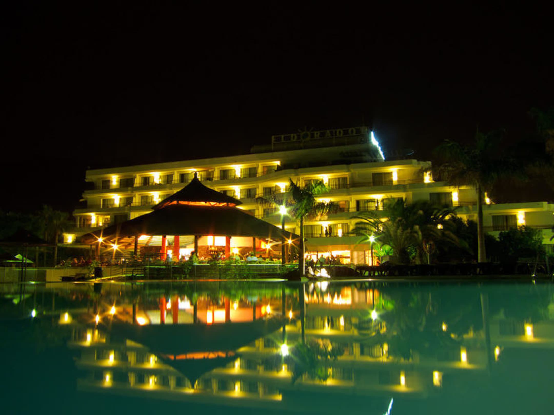 Poolanlage und Bar nachts
