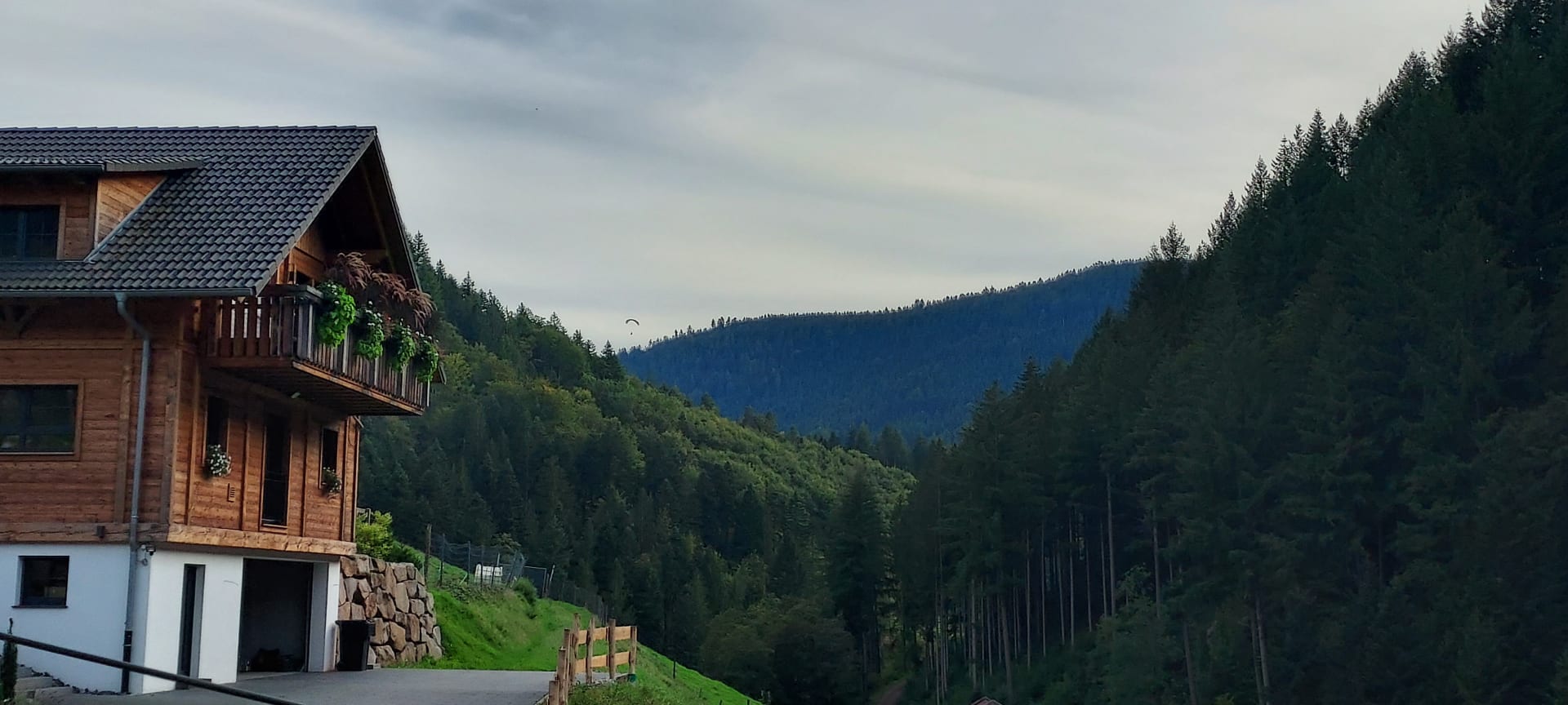 Blick zwischen den Bergen (links Gleitschirmflieger.Von Ferienwohnung aus fotographiert
