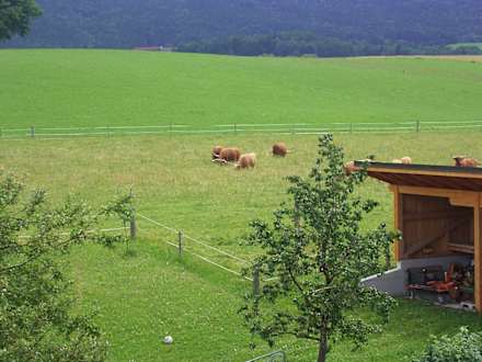 Hofeigene Hochlandrinder auf Weide vor dem Haus