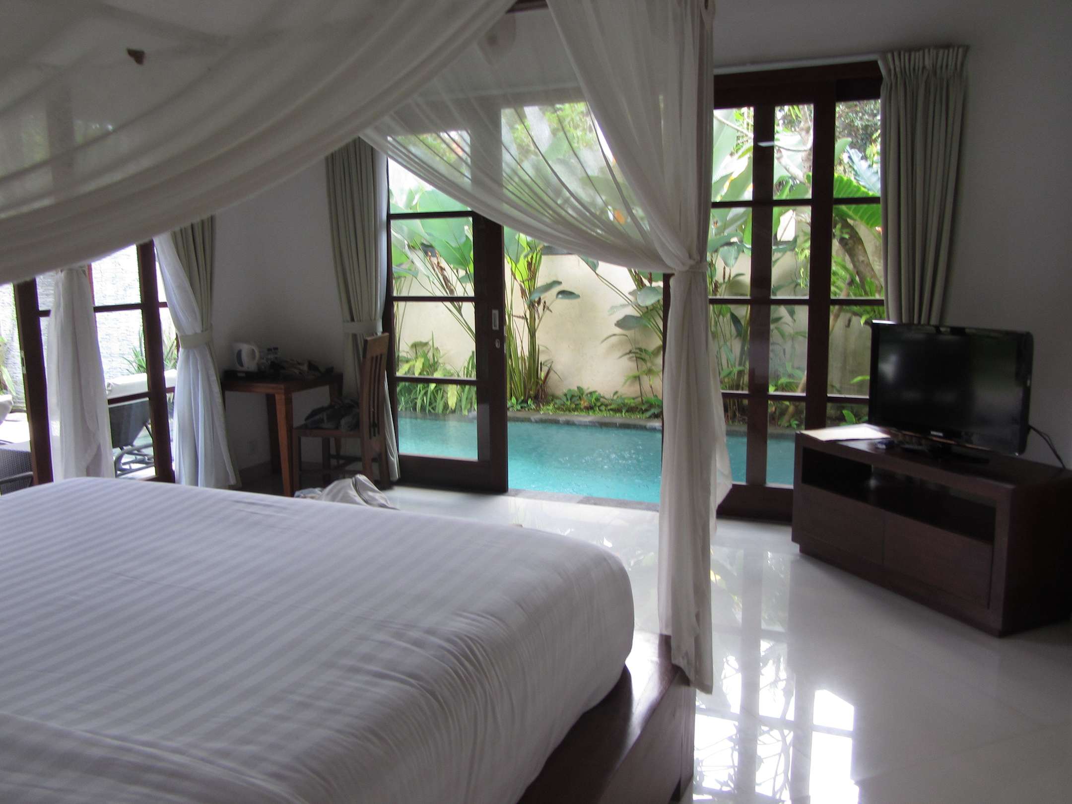 Blick vom Bett auf den Privatpool