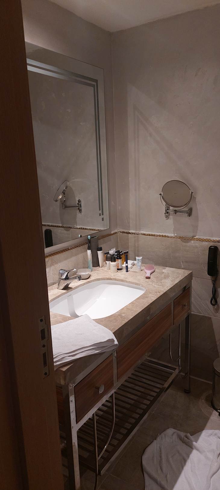Bad mit sehr großer Dusche, alles älter aber gepflegt und ordentlich