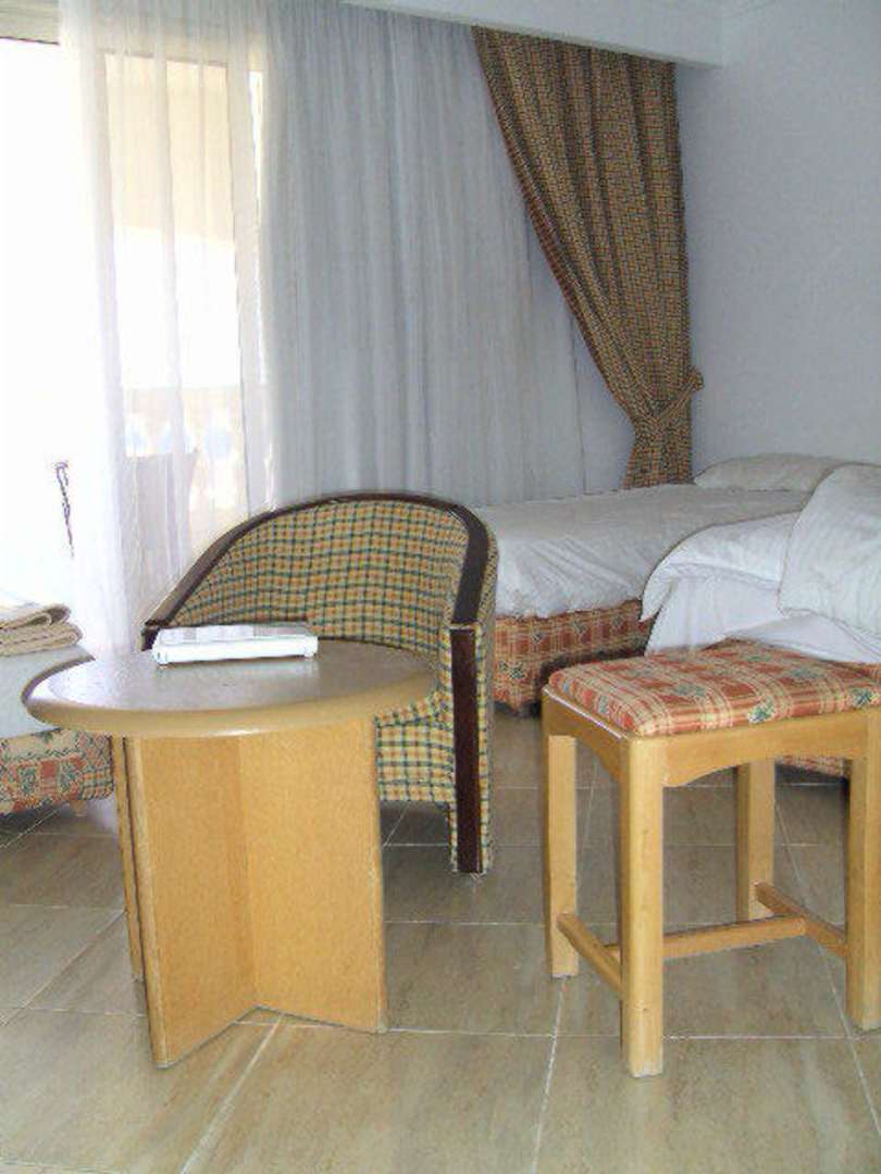 Zimmerausstattungmit Terrassentür, abdunkelndem Vorhang, Einzelbett, kleiner runder Tisch mit 2 Sesseln und einem Hocker