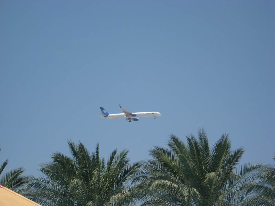 Landendes Flugzeug vom Hotel aus gesehen