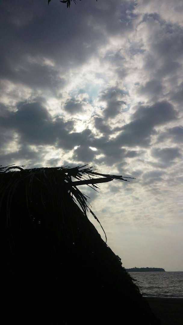 Wolkenstimmung. Im Vordergrund eine der Standhütten. Im Hintergrund Pandan Island