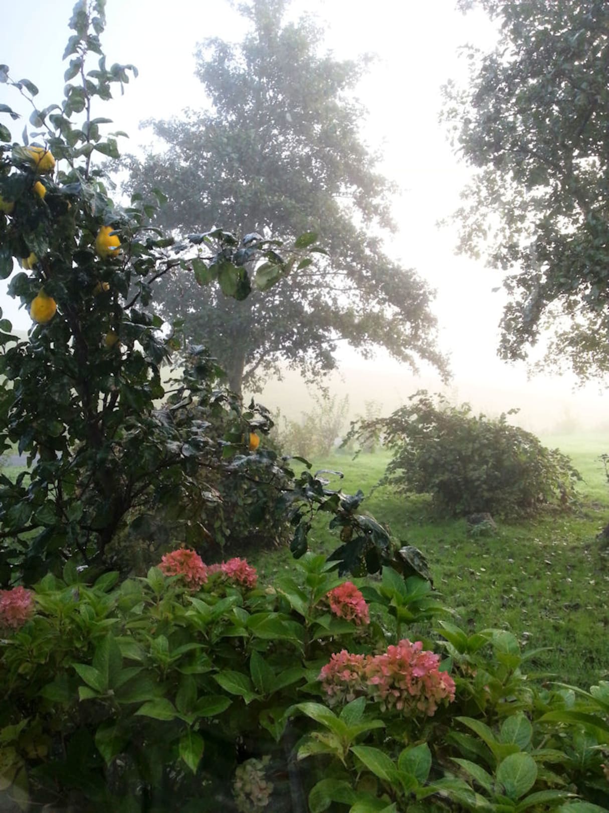 Blick aus dem Fenster in den herbstlichen Garten am Morgen.