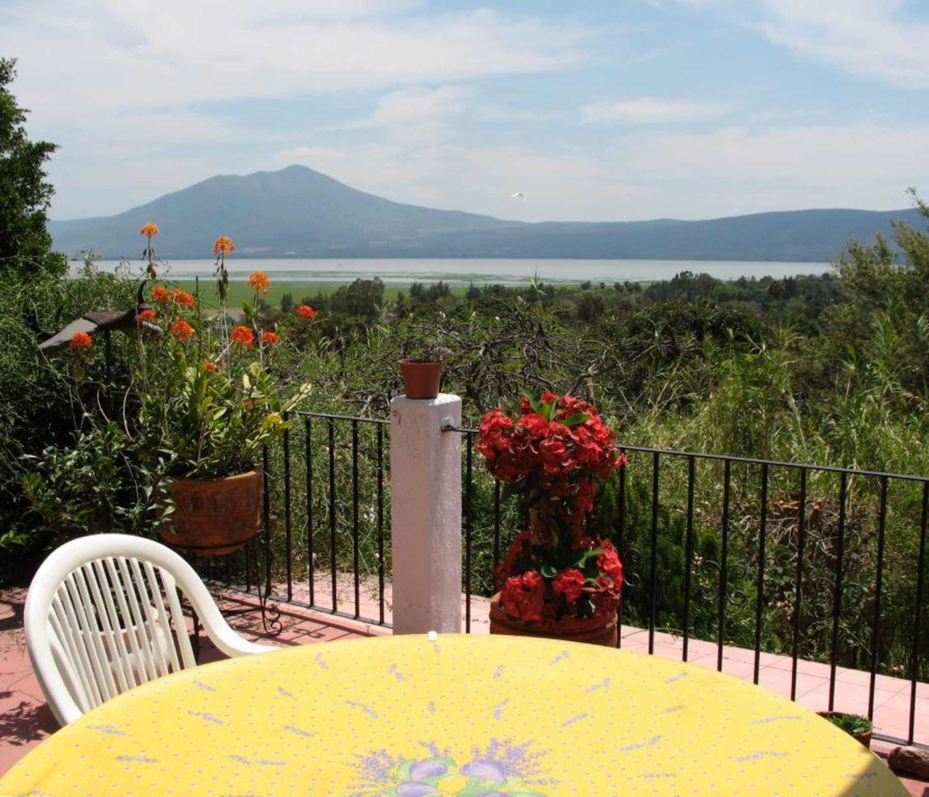 Fruehstueck mit Blick ueber Chapala SeeTish ist noch nicht gedeckt aber mann merkt es wird schon wieder einen perfeken Tag. Fruehstuck is ausreichend mit Eier, Kaffee, frischem Obst und frischgebackenem Brot. Nachher kann man einen netten typischen Ort besuchen, den Berg hinter dem Haus aufsteigen oderh einfach beim Schwimmbad faulenzen.