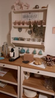 Raum zur Nutzung mit Kaffeemaschine, Büchern und vielen Prospekten zum schmökern