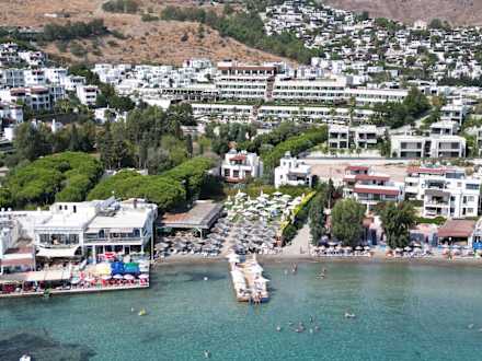 In der Mitte der Strandabschnitt des Hotels, dahinter das Hotel selbst