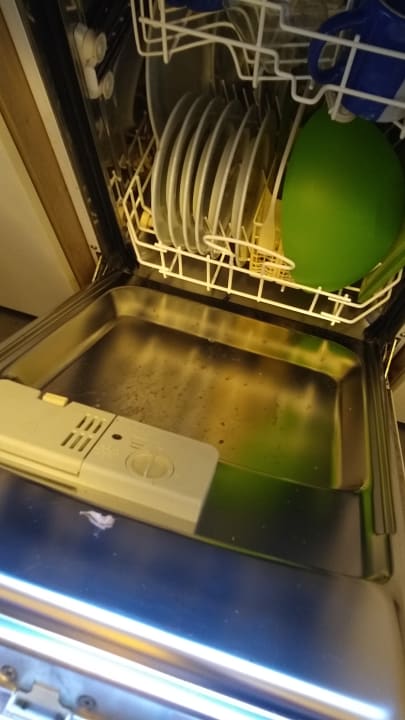 Dreckiges, eingetrocknetes Geschirr in der Spülmaschine