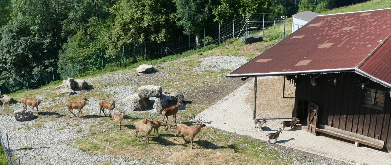 B7 Bergkristall: Rehe, Hirsche u. Ziegen im Tiergehege unterhalb unserer Suite. Blick vom Balkon.