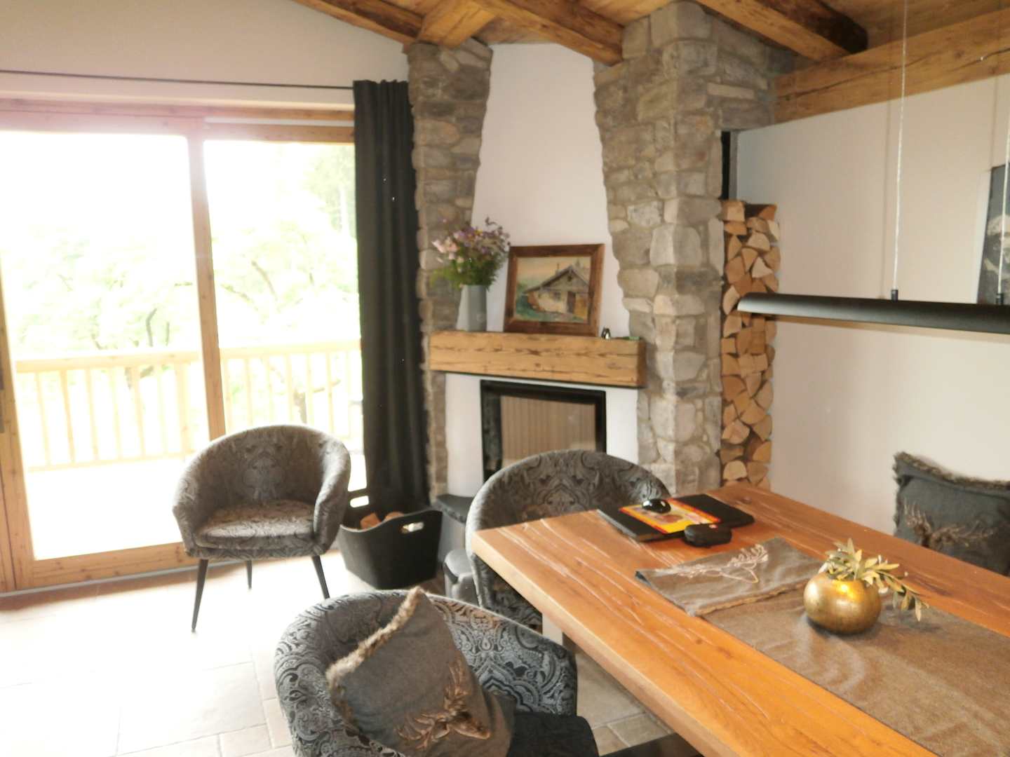Essecke mit Kamin, großer Tisch mit 6 Sitzmöglichkeiten