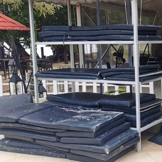 StrandDie Auflagen für die zum Teil defekten Holzliegen muss sich jeder selber abholen und selber reinigen.