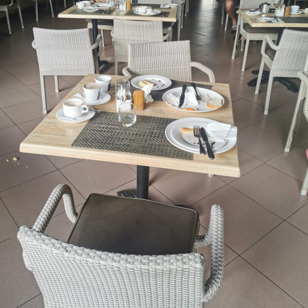 Allgemeiner Zustand: Dreckiger Boden und nicht abgeräumte Tische