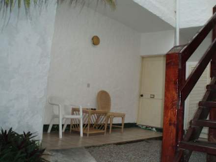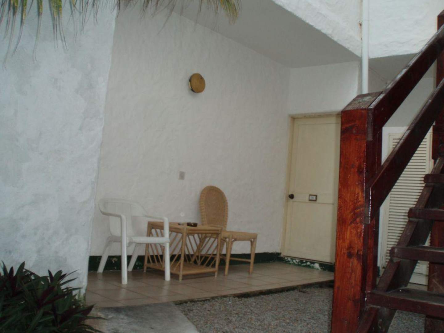 So sieht die Terrasse aus, wenn man ein Standardzimmer hat: Aussicht auf eine alte Holztreppe, Elektroschränke, Klimakompressoren und einige Kakerlaken. Berjaya Resort Praslin