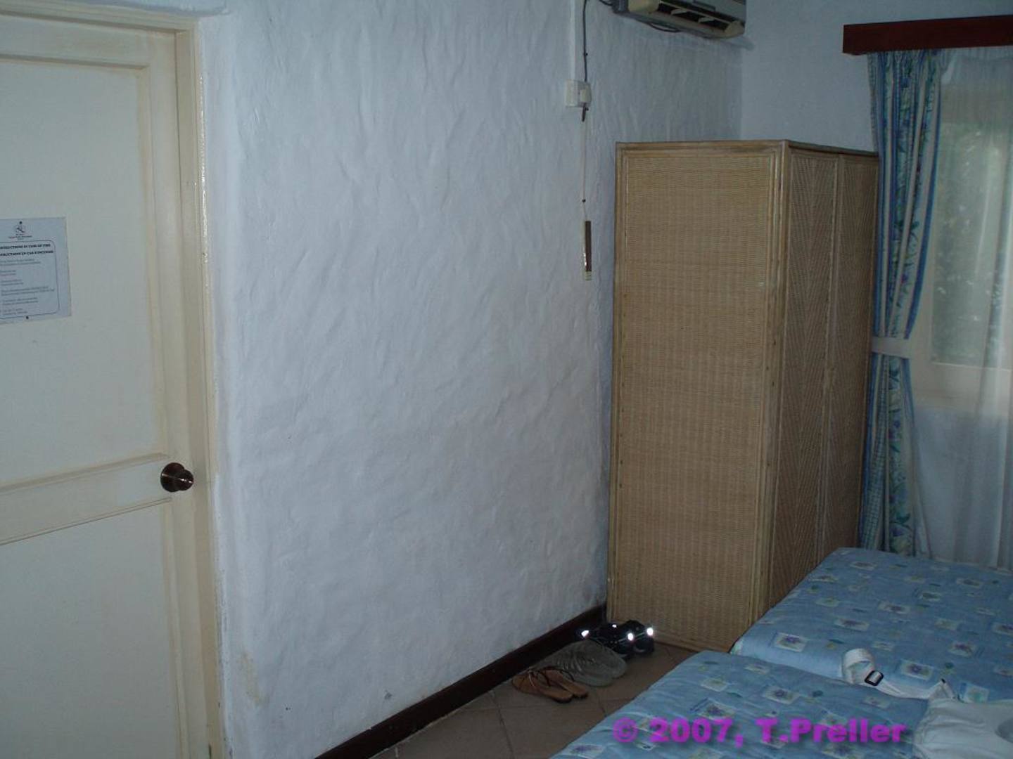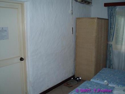 Oberhalb des wackeligen und stinkenden Schranks befindet sich die lärmende Air Condition, die sporadisch funktioniert. Links die Tür zum Badezimmer. Zwischen Wand und Bett ca. 60 cm Abstand.